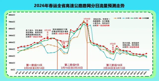 整体呈现:“春节前集中返乡、快速走高,春节期间高峰缓降、多日聚集,春节后分散返程、波动平稳”趋势特征,主要分为三个阶段:
