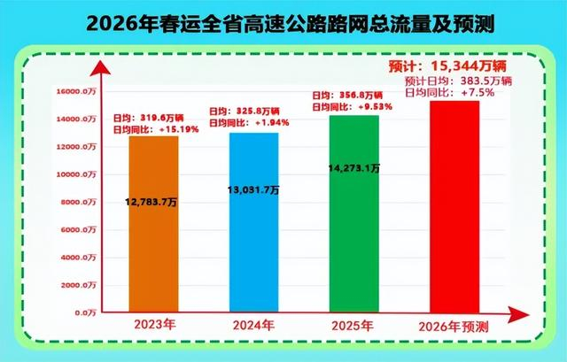 预计2026年春运全省高速公路出入口总流量为15,344万辆,较2025年春运同比增长7.5%,日均流量383.5万辆,为平日流量的1.6倍(2025年日均流量为241万辆)。省内中短途自驾车辆占比高,出行时段较为集中,多种车流叠加,客流呈阶段性变化,路网车流量保持高位运行。