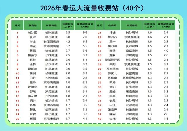 预测2026年春运期间长沙收费站出入口日均流量达6万辆,峰值7万辆,呈潮汐分布特征。自杭长高速长永段实行“零费率”政策以来,通行秩序总体平稳顺利,流量增长呈渐进式上升趋势。预测春运期间该路段的收费站流量将进一步增长,高峰时段收费站易出现排队缓行现象,主线通行压力剧增。